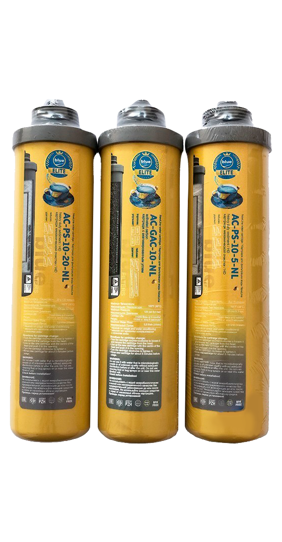 Посилений комплект картриджів для системи Bluefilters AC-PS-10-20-NL, AC-GAC-10-NL, AC-PS-10-5-NL Bluefilters; Зроблено в Німеччині.